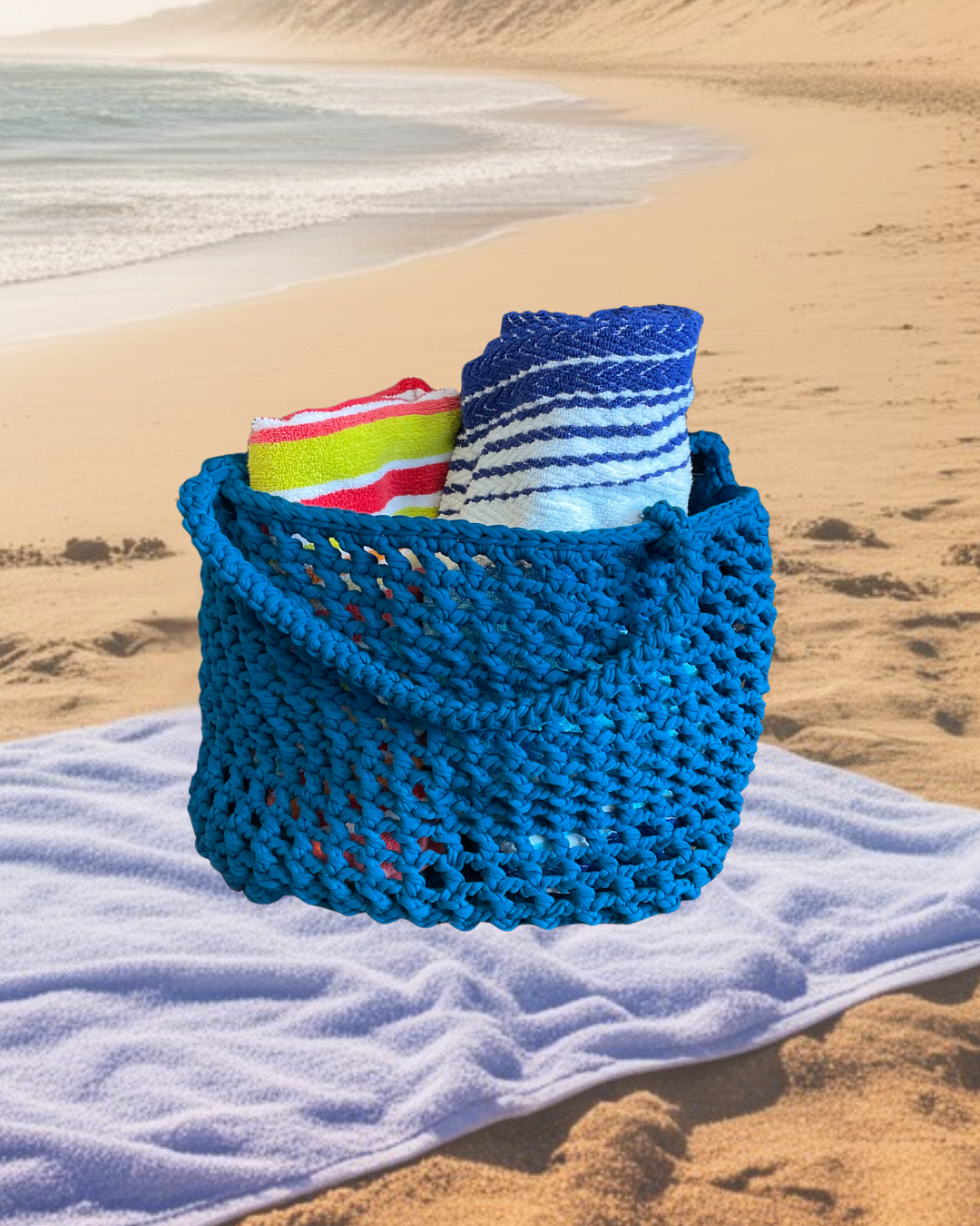 This handmade beauty is crafted from 100% recycled cotton T-shirt yarn, making it as kind to the planet as it is to your style. Spacious enough for all your summer essentials—towels, sunscreen, snacks, you name it—this functional tote is your new go-to companion.